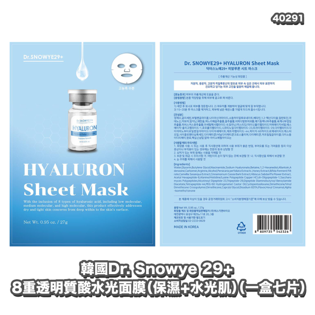 40291.🐥執雞🐥韓國DR.SNOWYE 29+ Hyaluron Sheet Mask 8重玻尿酸水光面膜(保濕+水光肌)(藍色)(一盒七片)⚠️數量有限⚠️先入先得⚠️售完即止⚠️
