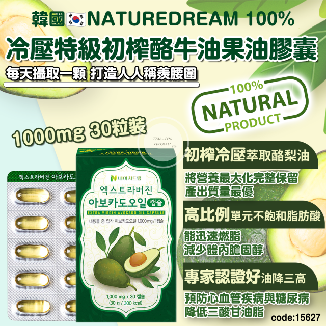 15627.25/2韓國🇰🇷連線 NATUREDREAM 100% 冷壓特級初榨酪牛油果油膠囊(30粒)⚠️預訂需時3-4星期