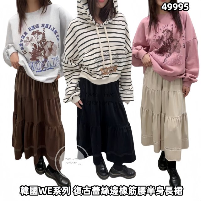 韓國WE系列 復古蕾絲邊橡筋腰半身長裙【買五件包郵及送東大門電話繩一條 | 31/10截單 | 預計12月初至中到貨 | 20251026B(49995.)】
