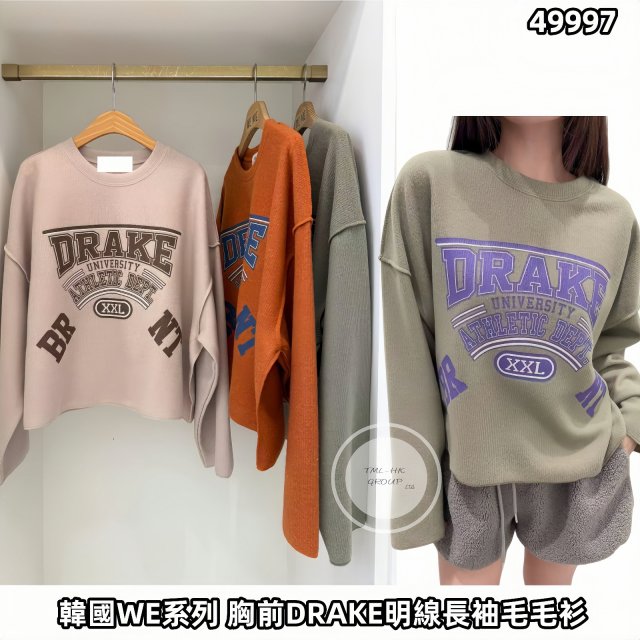 韓國WE系列 胸前DRAKE明線長袖毛毛衫【買五件包郵及送東大門電話繩一條 | 31/10截單 | 預計12月初至中到貨 | 20251026B(49997.)】