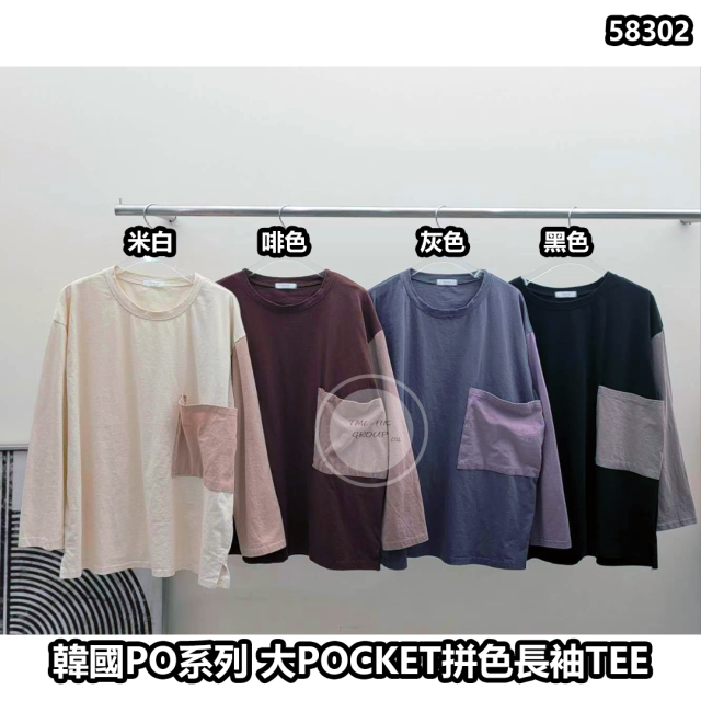 韓國PO系列 大POCKET拼色長袖TEE【5件自選包郵 | 6/11截單 | 預計12月中到貨 | 20251102B(58302.)】