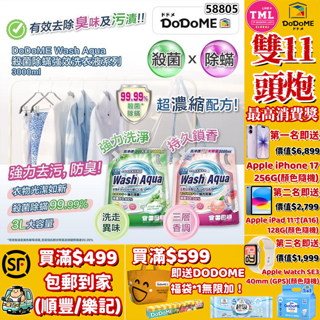 DoDoME 殺菌除蟎強效洗衣液(3L)【滿$499包郵 | 滿$599送福袋 | 11/11截單 | 預計12月初至中到貨 | 20251106(58805.)】