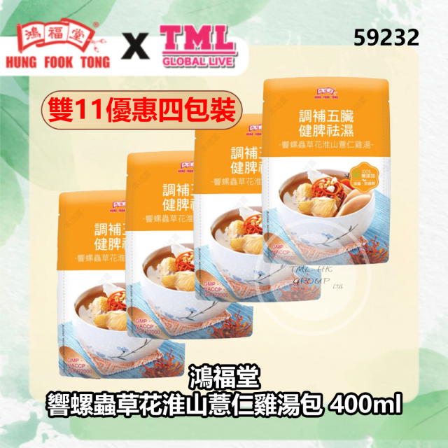 [雙11優惠四包裝] 鴻福堂 響螺蟲草花淮山薏仁雞湯包 400ml(褔利款)【買滿$499包郵 | 14/11截單 | 預計12月初至中到貨 | 20251109(59232.)】