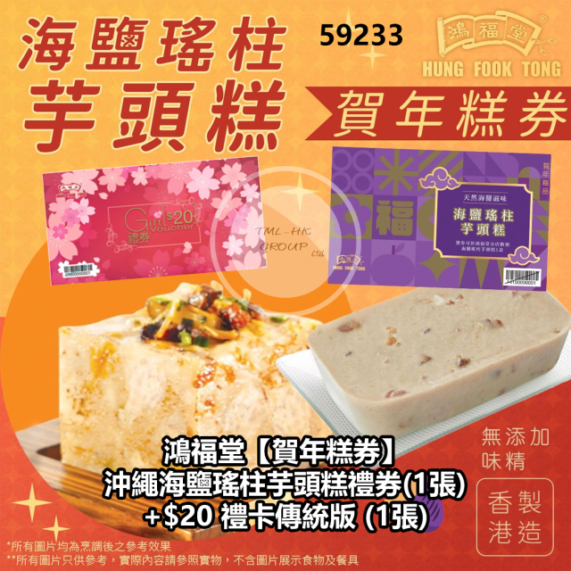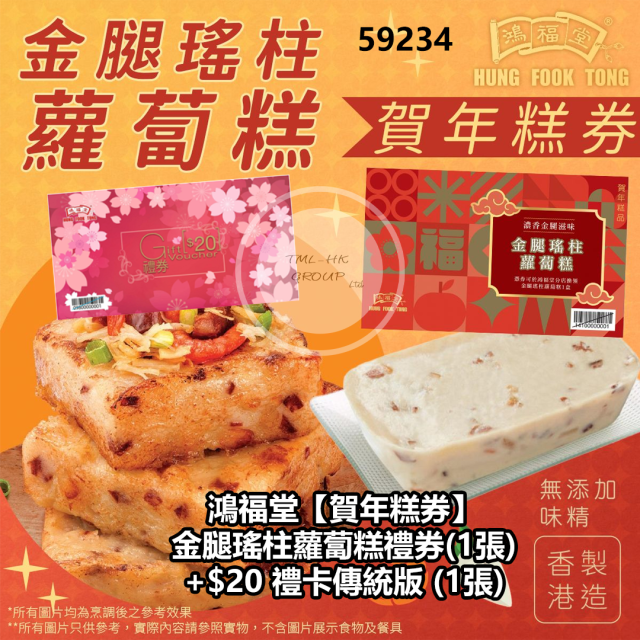 鴻福堂【賀年糕券】金腿瑤柱蘿蔔糕禮券(1張) + $20 禮卡傳統版 (1張)(褔利款)【買滿$499包郵 | 14/11截單 | 預計12月初至中到貨 | 20251109(59234.)】