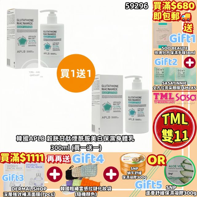 SASA X TML 韓國APLB 穀胱甘肽煙酰胺美白保濕身體乳 300ml【全場買滿$680包郵 | 買一送一 | 16/11截單 | 預計聖誕前收貨 | 20251111(59296.)】
