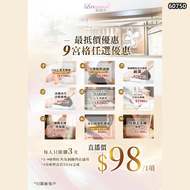 TML X LUX Medical $98九宮格任選套餐(每人限購3次,款式不能重複)【新客戶優惠 | 13/1截單 | 1月中前會聯絡客人預約 | 20260108(60750.)】