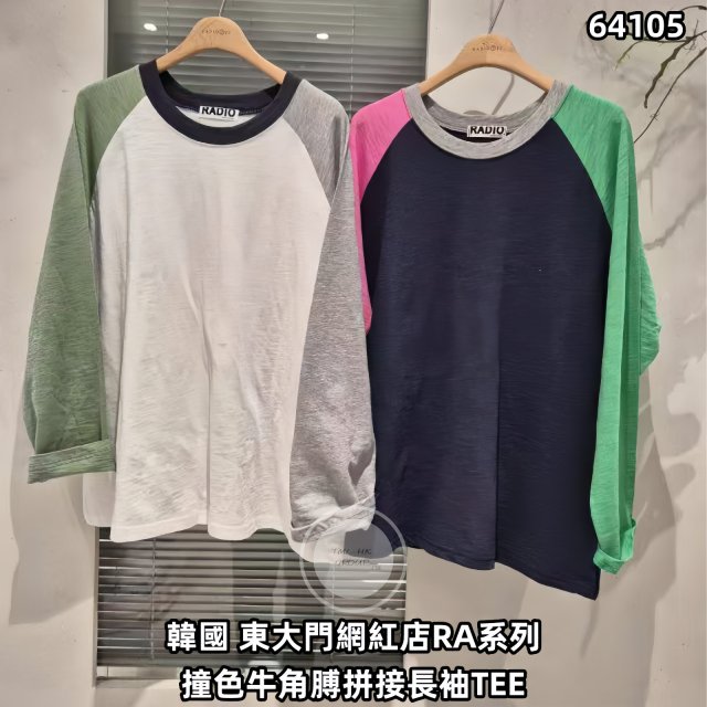 韓國 東大門網紅店RA系列 撞色牛角膊拼接長袖TEE【買滿5件包郵 | 7/4截單 | 預計5月初至中到貨 | 20260402B(64105.)】
