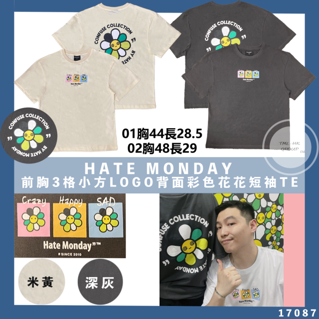 17087.HATE MONDAY前胸3格小方LOGO背面彩色花花短袖TEE(S2304T04)