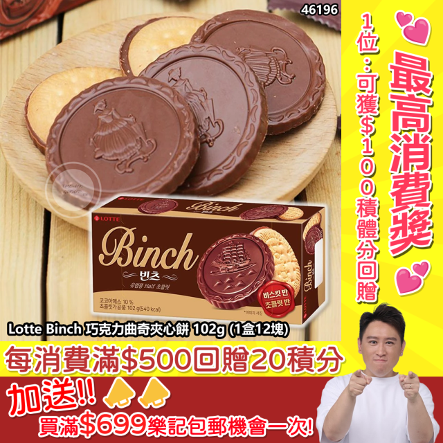 🐥執雞🐥韓國零食場 Lotte Binch 巧克力曲奇夾心餅 102g (1盒12塊)【1(46196.)】⚠️數量有限⚠️先入先得⚠️售完即止⚠️