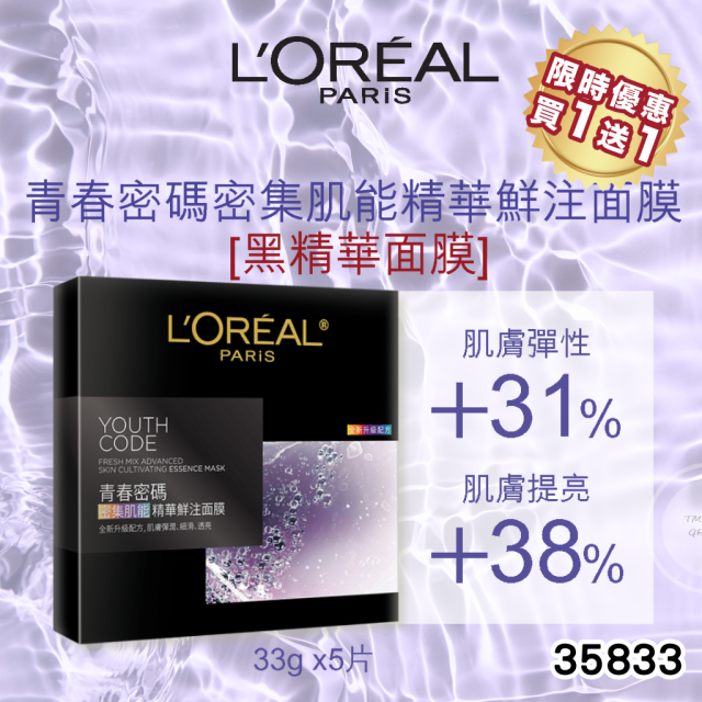 35833.🐥執雞🐥(限時優惠買一送一)L'Oreal Paris 青春密碼密集肌能精華鮮注面膜 [黑精華面膜] 33g X 5片⚠️數量有限⚠️先入先得⚠️售完即止⚠️