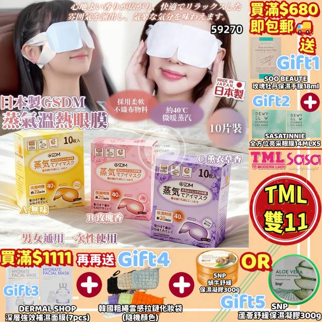 🐥執雞🐥SASA X TML 日本GSDM蒸氣溫熱眼膜 10包(一套三盒)(無香+玫瑰香+薰衣草香)【(59270.)】⚠️數量有限⚠️先入先得⚠️售完即止⚠️