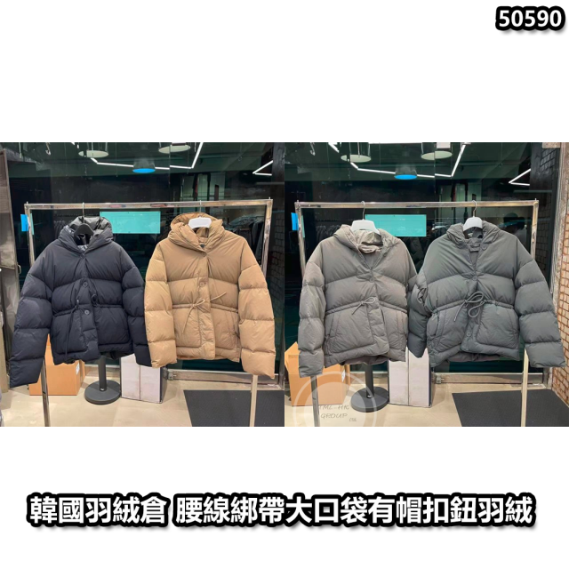 韓國羽絨倉 腰線綁帶大口袋有帽扣鈕羽絨 (bn2419)【1/10截單 | 預計11月中到貨 | 20250926B(50590.)】