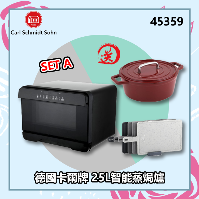 45359.🔴包郵樂記🔴德國卡爾牌 25L智能蒸焗爐🔴SET A🔴送🎁20cm 鑄鐵雙耳煲連蓋 + 4件套分類砧板 (每購買1SET回贈 $100購物金)⚠️21/5截單⚠️預計6月尾到貨❣️