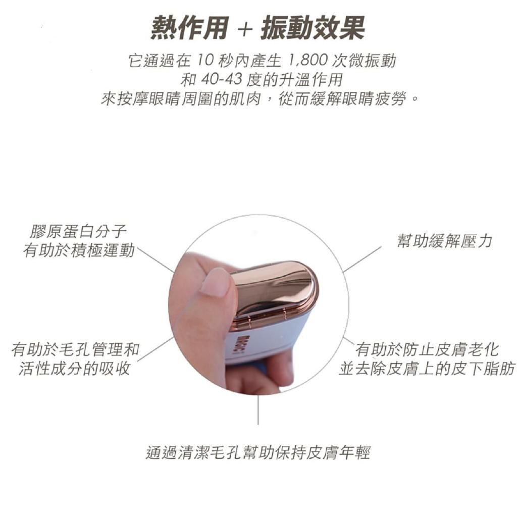 首創雙頭設計,玫瑰金頭可加強排毒和微震動效果,疏通眼周淋巴位置和積聚浮腫😍,三色LED寶石光技術📊,集中於美白除皺抗衰老功能性,極快將眼同眉係戚左上去,強力擊退眼紋同眼袋👀,舒服到好似人手按摩💆🏻♀️
