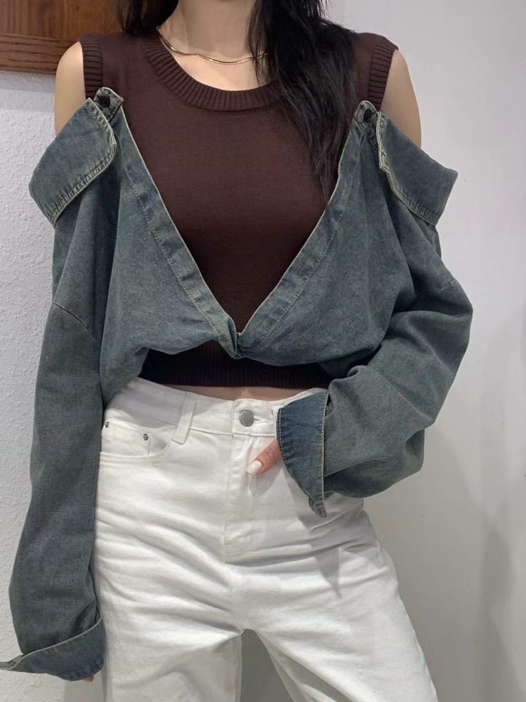 韓國MO系列 牛仔假兩件露肩長袖TEE【現貨 | 預計2-3星期派貨 | 20260110Z(24446.)】