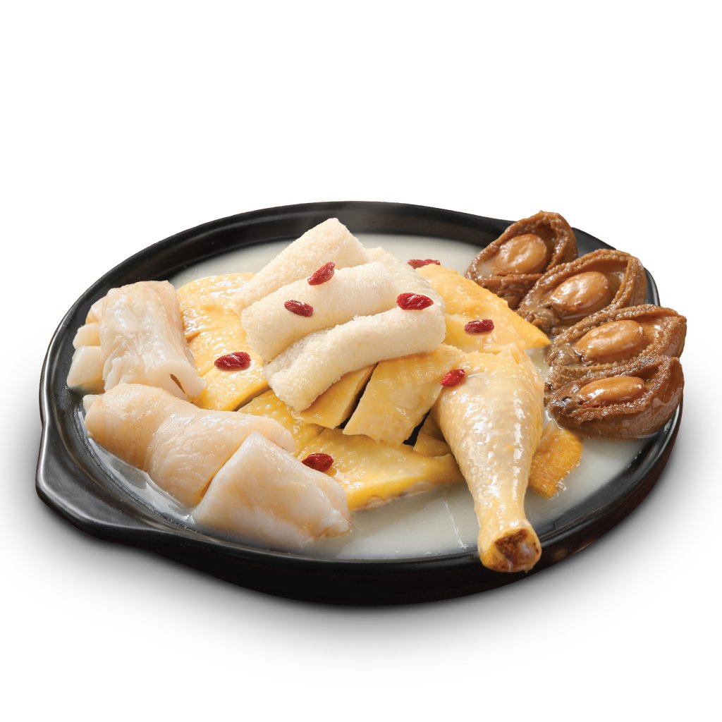 高湯經36小時餚製配以鮑魚及花膠。嚴選新鮮農場走地雞,肉質鮮嫩結實,盡吸湯底精華,味道比一般雞更有層次。高湯與頂級食材完美結合既滋養又充滿骨膠原。
