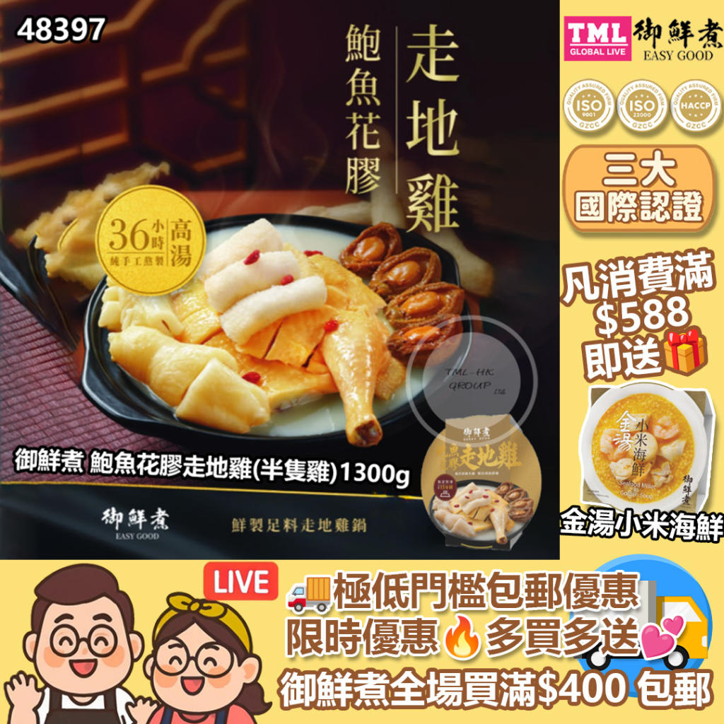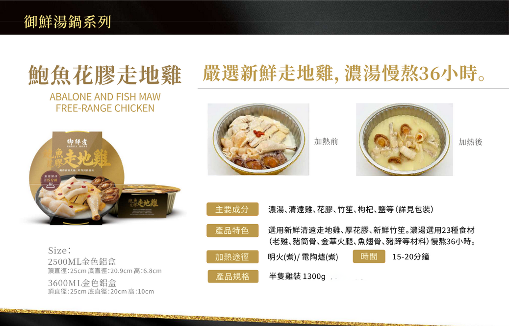 不夾單團 御鮮煮 鮑魚花膠走地雞(半隻雞)1300g【買滿$400包郵 | 買滿$588再送1盒⾦湯小米海鮮 | 17/10截單 | 預計27/10開始由供應商出貨 | 20251012(48397.)】