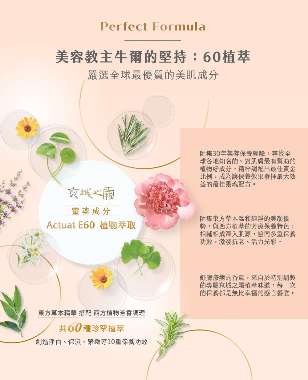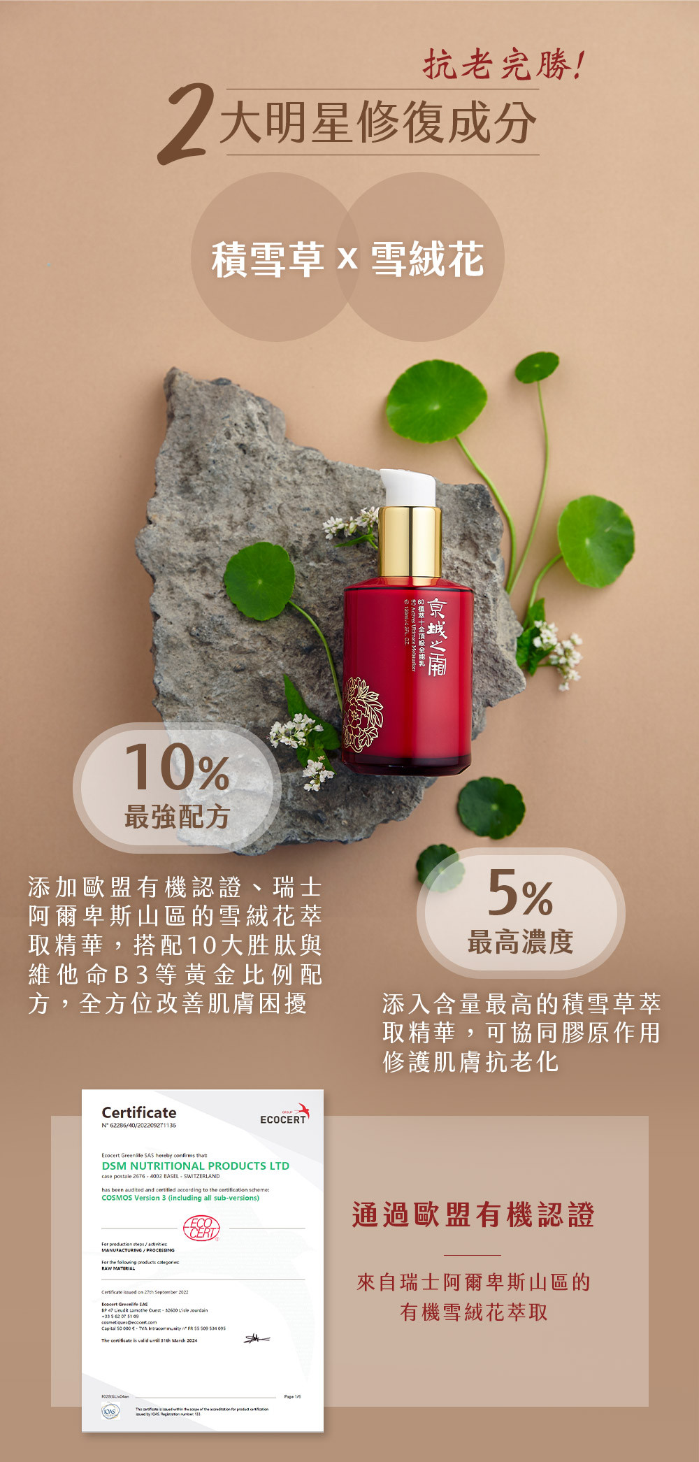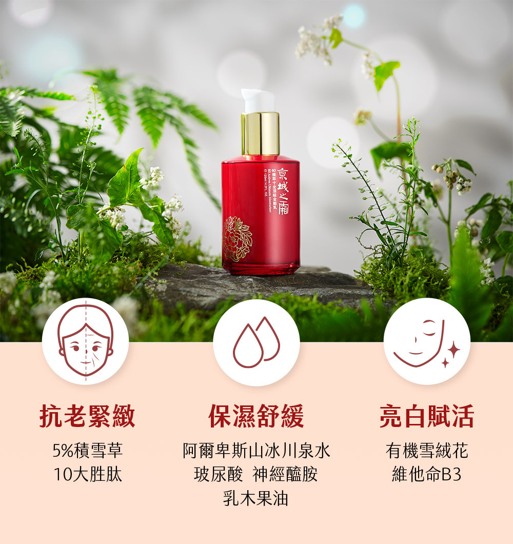 京城之霜暢銷經典的全能乳,是一款輕潤不黏膩的「精華級」抗老凝乳,5%積雪草萃取與歐盟有機認證的雪絨花精華,搭配十大煥顏胜肽、60植萃成分,提供全效型減齡保養,一瓶滿足緊、彈、嫩、透的肌膚需求。