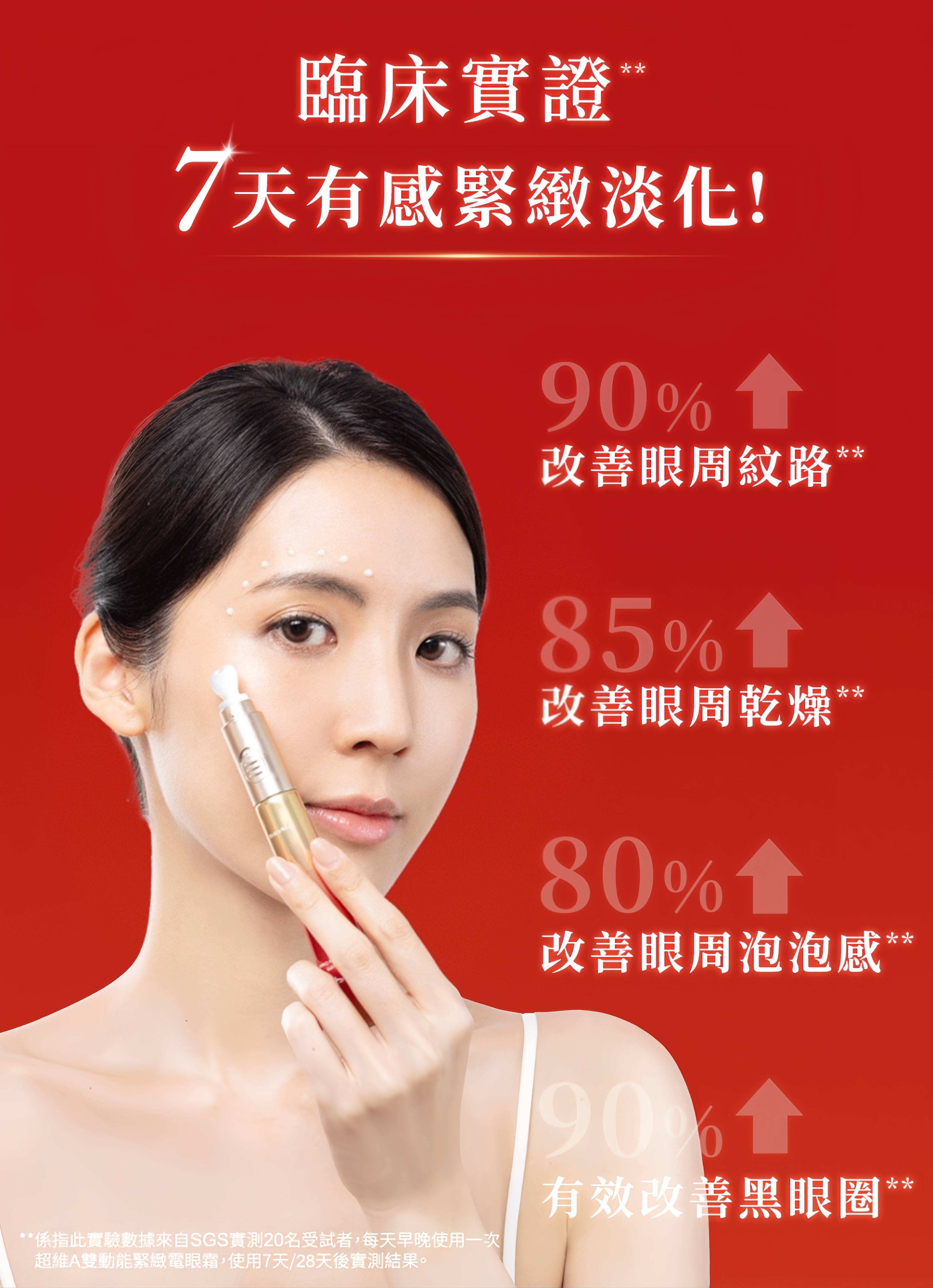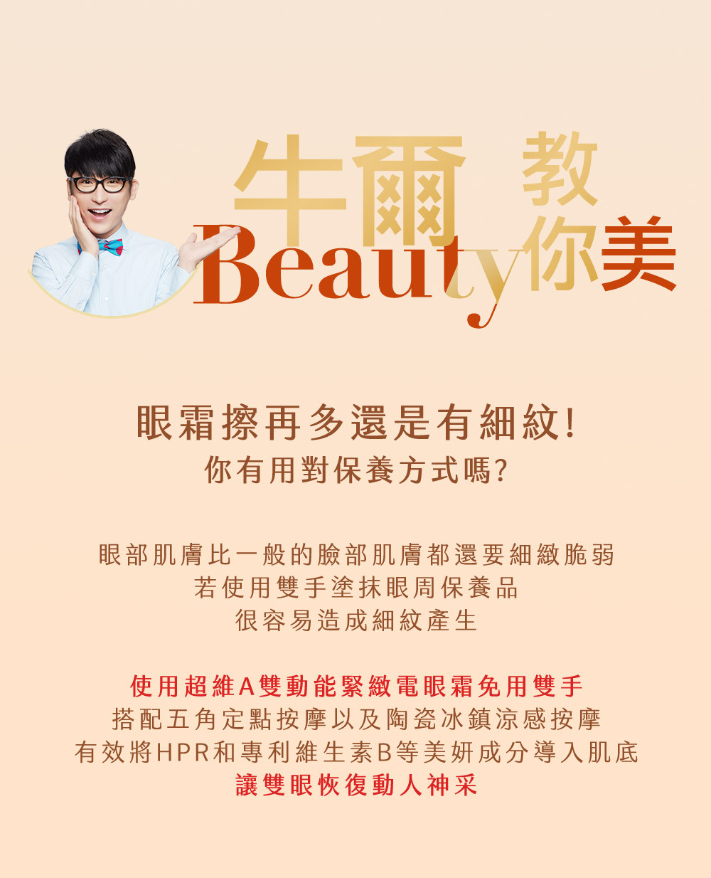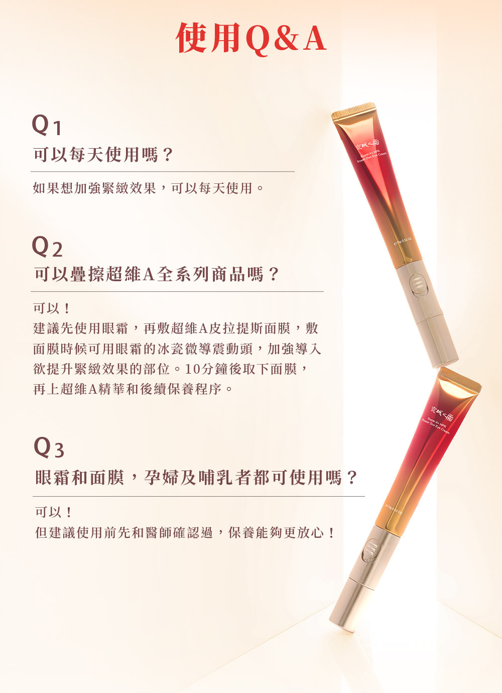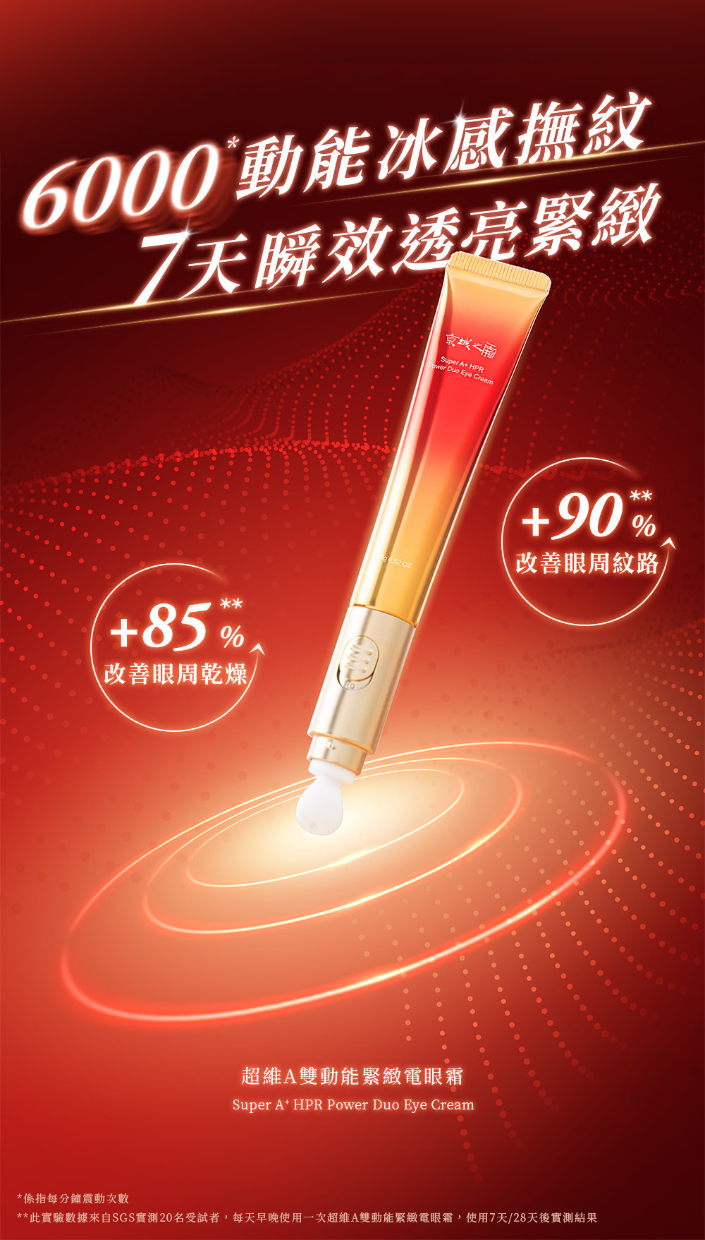 超維A低敏無痛特性,用在眼周更有感!添加積雪草、金盞花及韓國專利B群後生元,有效幫助眼周緊緻撫紋,維持眼周澎彈水潤,每分鐘6000次冰鎮陶瓷震動,讓有效成分直達眼周基底,細紋鬆垮拉提歸位!因為無痛低刺激,白天晚上都能使用,深度抗皺,速效抗老。