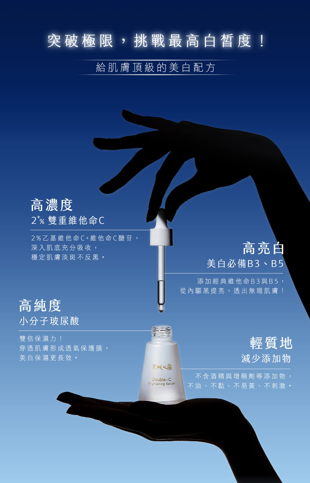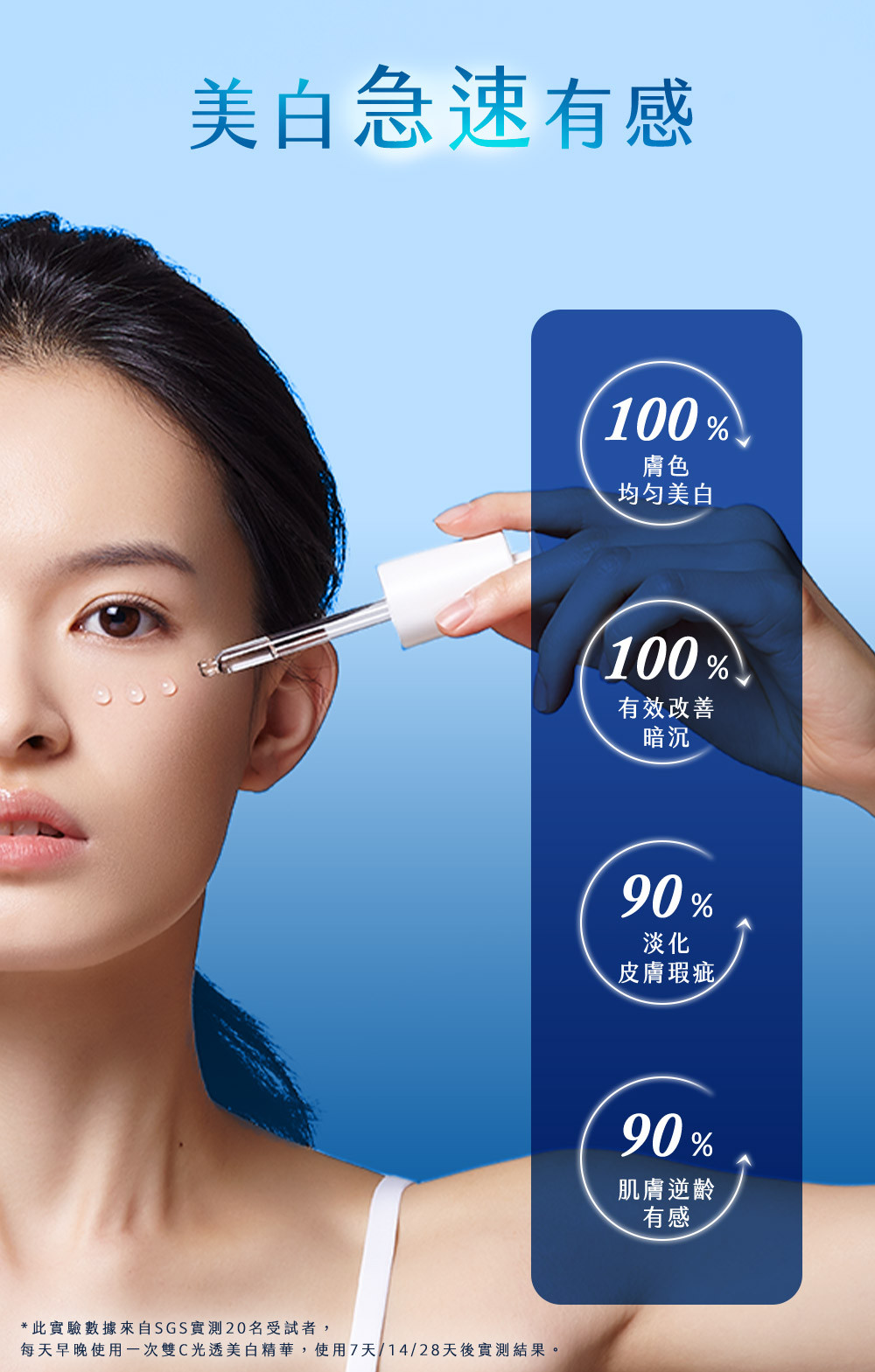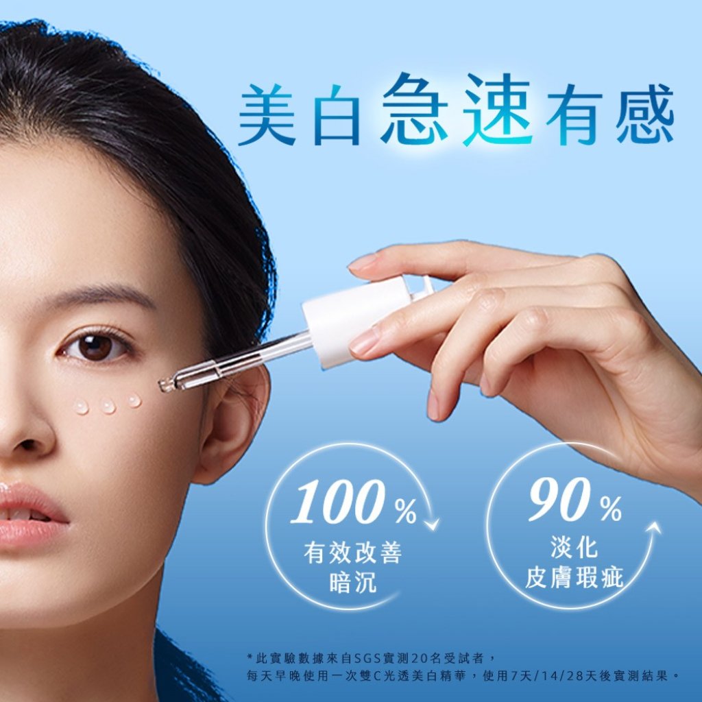 美白急速有感!雙重維他命C深入肌底淡斑不反黑,再加上維他命B3、B5,從內驅黑提亮,透出無暇肌,高純度小分子玻尿酸,美白保濕更常效,不含酒精、不黏、不易黃、不刺激。