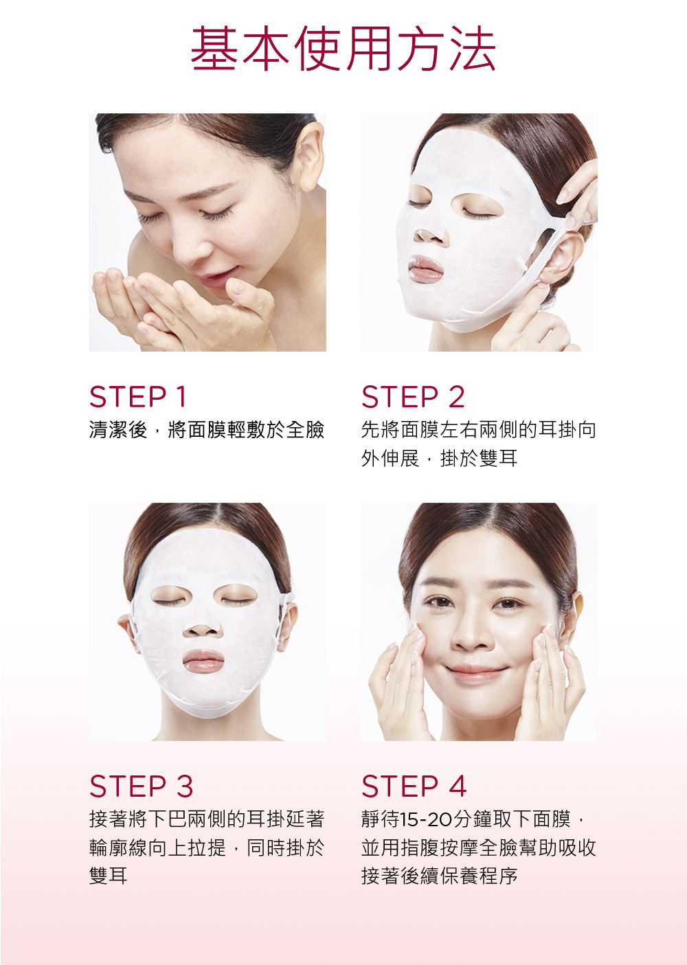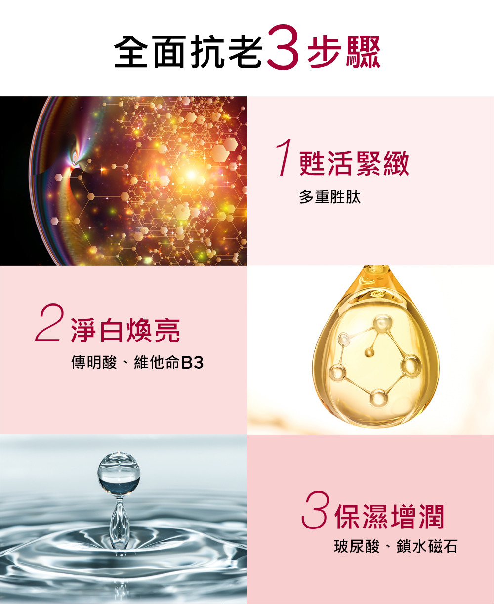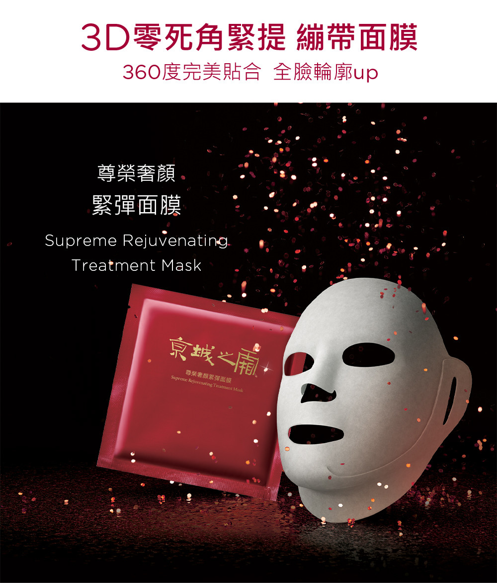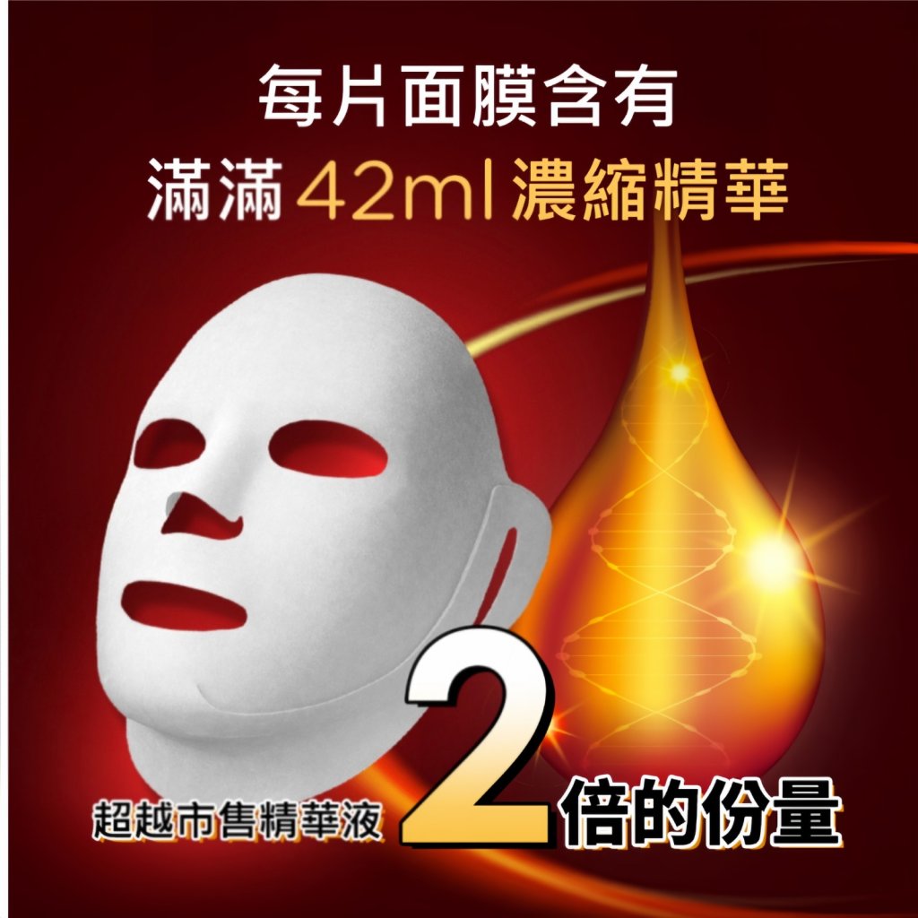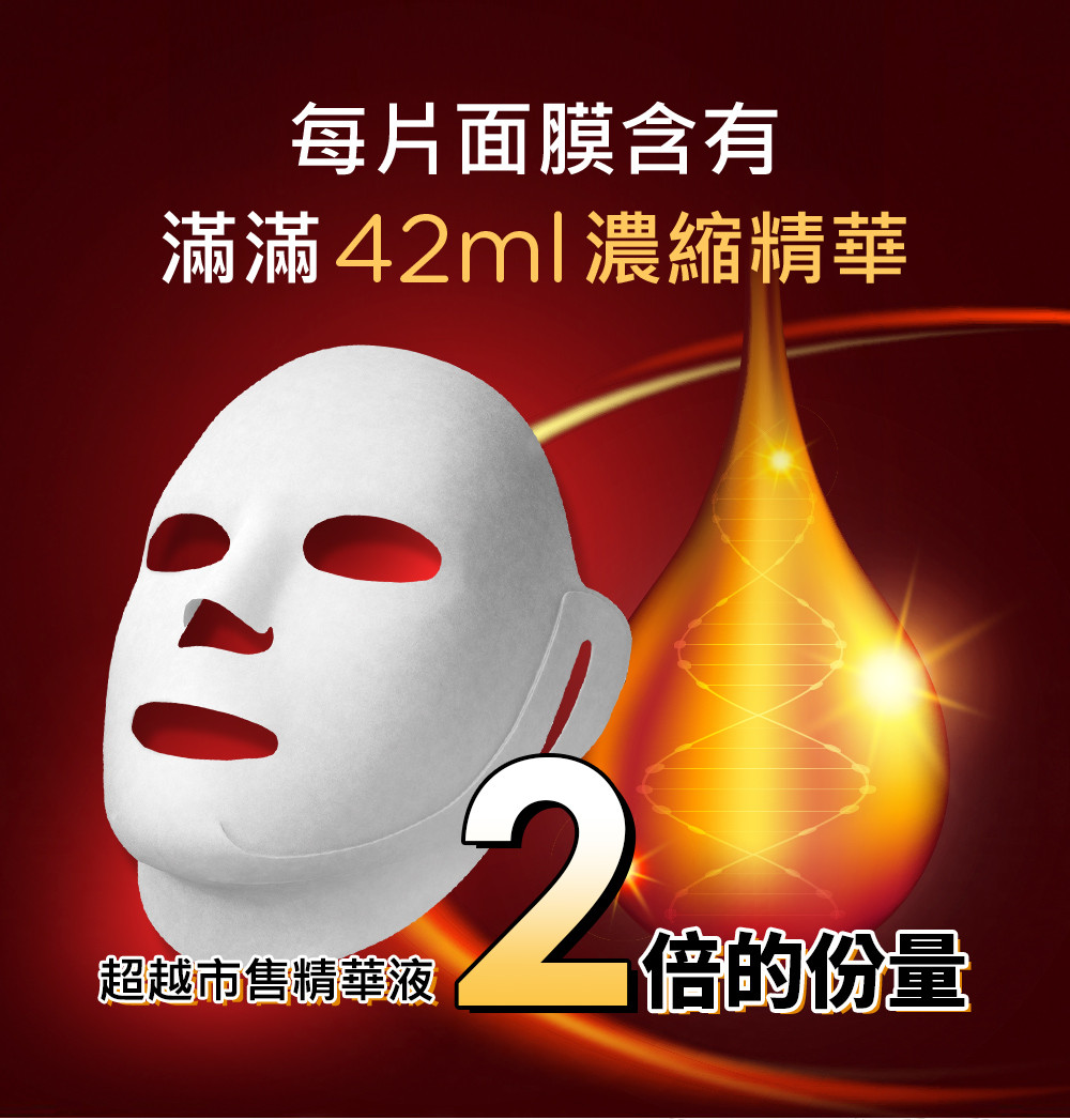 蘊含42ml滿滿高單位濃潤精華的 3D立體面膜,極貼膚、超柔細耳掛式布膜設計,完整包覆全臉每個細節深入加強保養,全面緊提抗皺。
