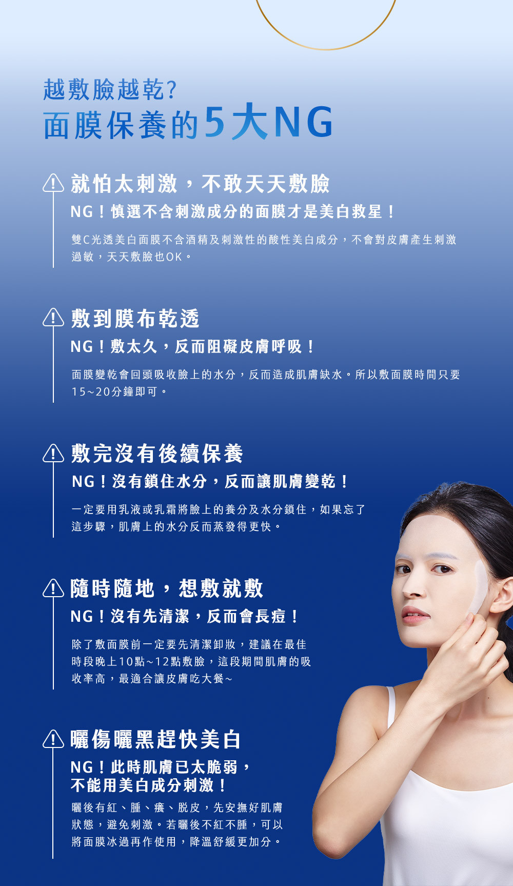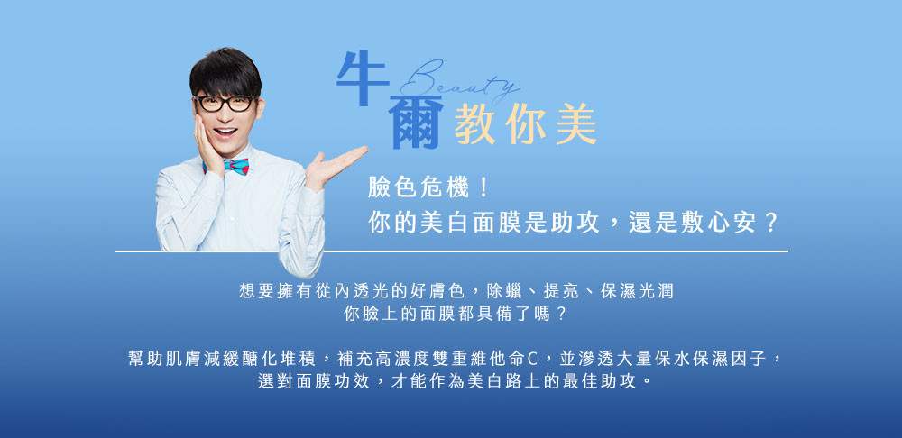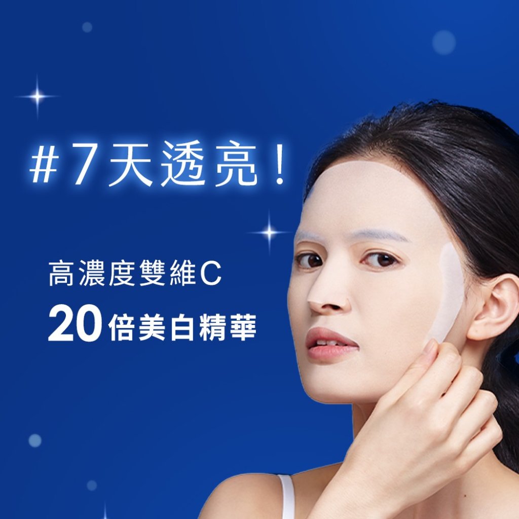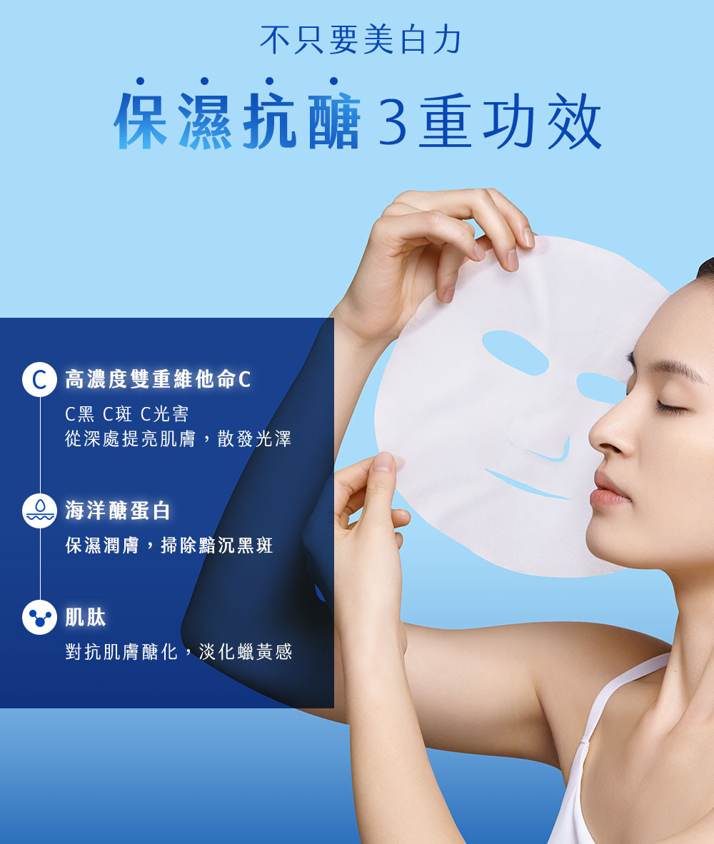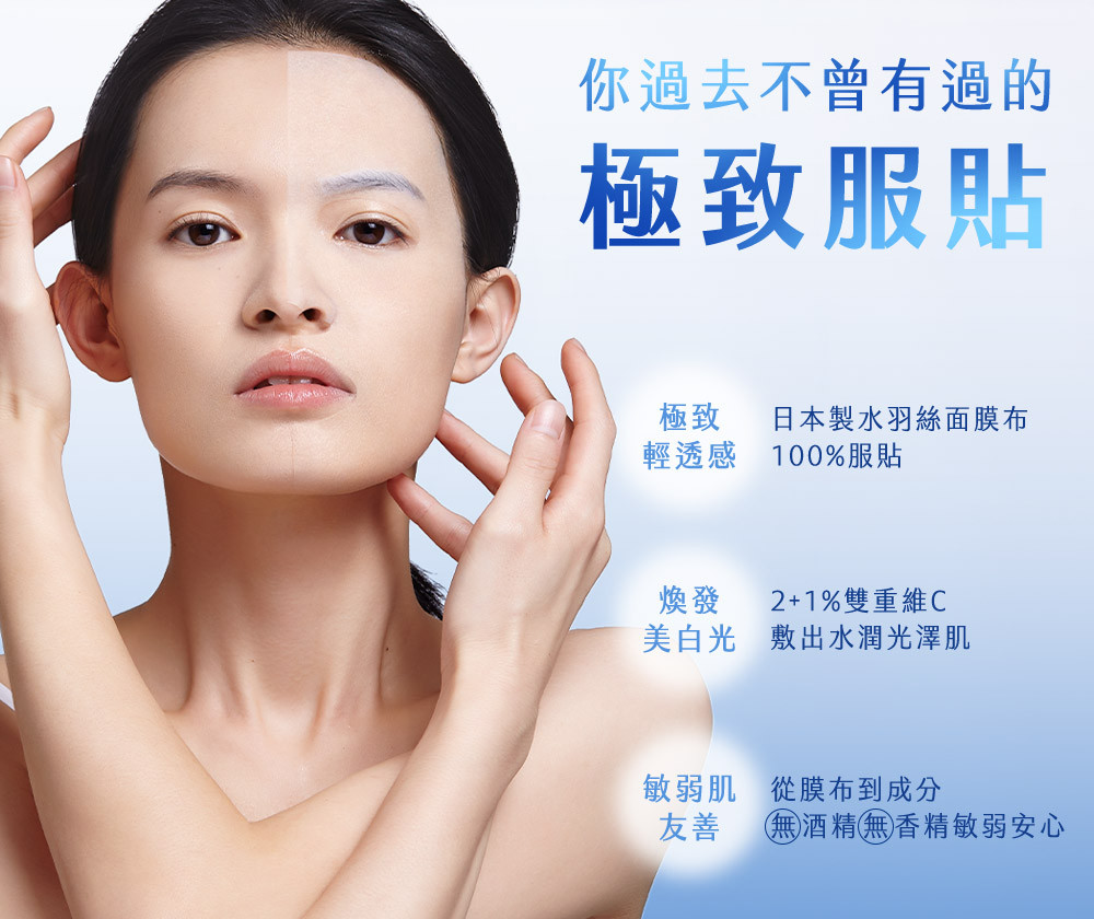 美白急速有感!最細緻的水羽絲面膜,吸飽滿滿20倍雙重維他命C美白精華,深入肌底充分吸收,添加海洋醣蛋白跟肌肽,幫助肌膚對抗醣化,掃除黯沉、淡化蠟黃超有感,不含防腐劑,敏弱肌友善,天天敷臉都OK。