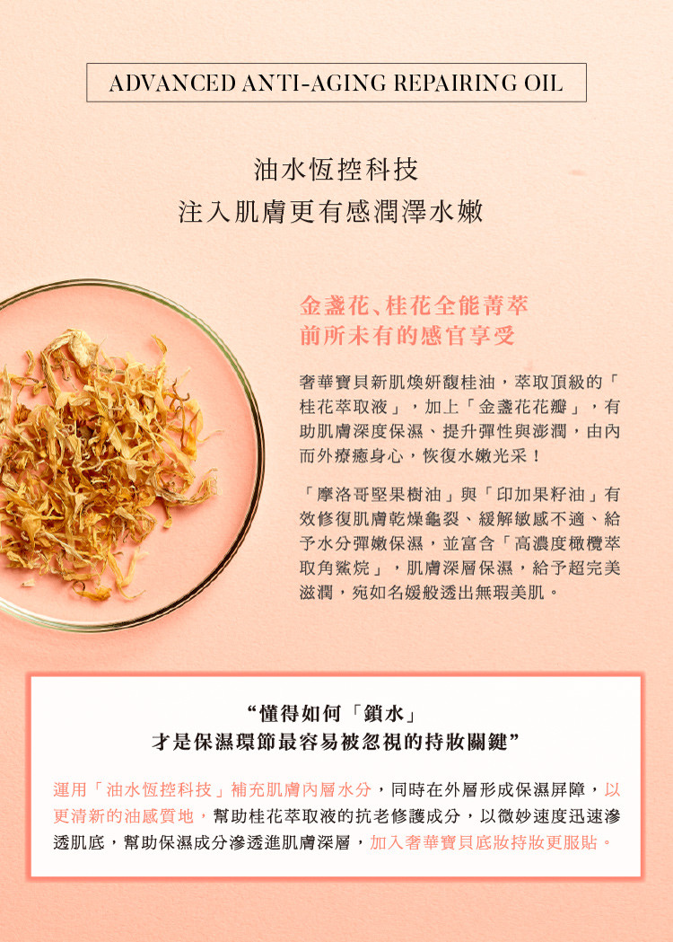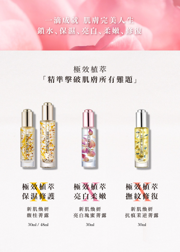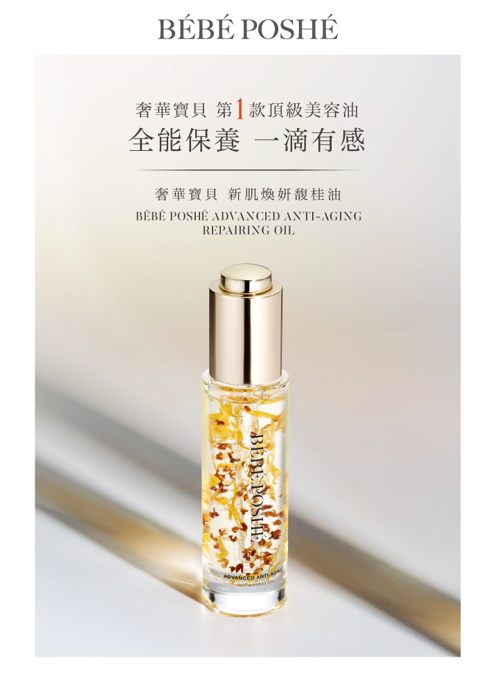 肌膚要做到真正的保濕,維持平衡的水油比例是很重要的,BÉBÉ POSHÉ奢華寶貝改善早期著重高營養、高滋潤,質地也較厚重的保養油,運用油水恆控科技補充肌膚內層水分同時在外層形成保濕屏障,以更清新的油感質地,幫助桂花萃取液的抗老修護成分,以微秒速度迅速滲透肌底,為肌膚缺水補水、缺油補油,油水協力重建平衡美肌,給予肌膚充足的水分及鎖住水分的油比例,讓肌膚展現健康光澤。