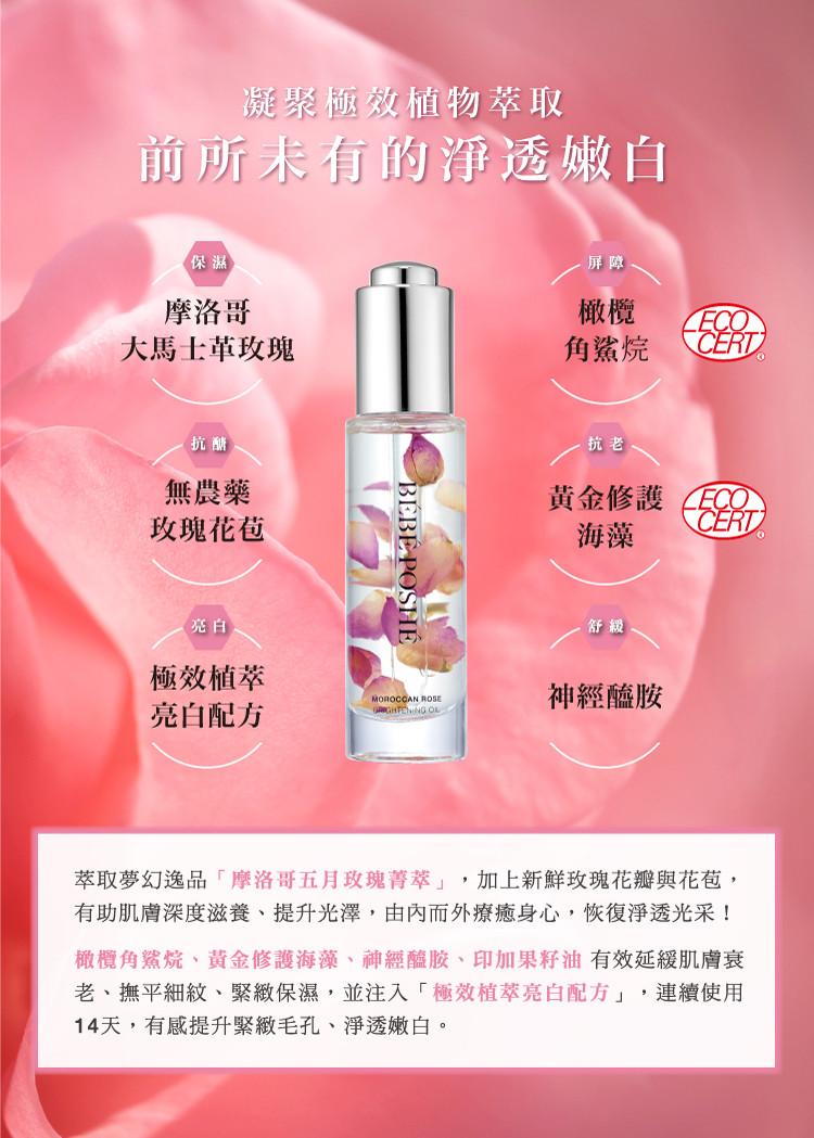 凝聚極效植萃取以微秒速度迅速滲透肌底,讓肌膚呈現完美嫩白保濕,就像為肌膚穿上一層輕盈的絲緞內衣,搭配BÉBÉ POSHÉ奢華寶貝任何底妝產品,妝感更加輕透服貼!