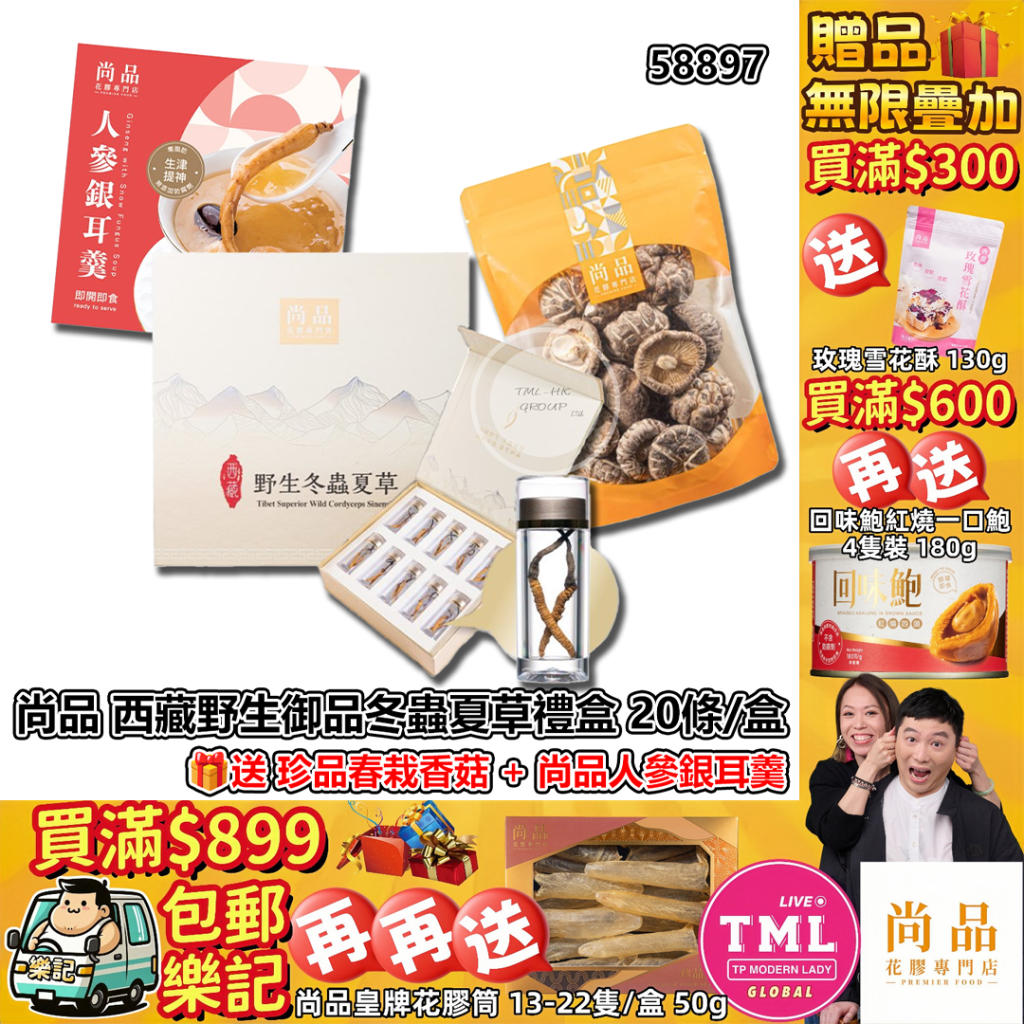 主頁 TML X 尚品 西藏野生御品冬蟲夏草禮盒 20條/盒 送 珍品春栽香菇 + 尚品人參銀耳羹 各1【17/11截單 | 預計12月中派貨 | 20251112(58897.)】