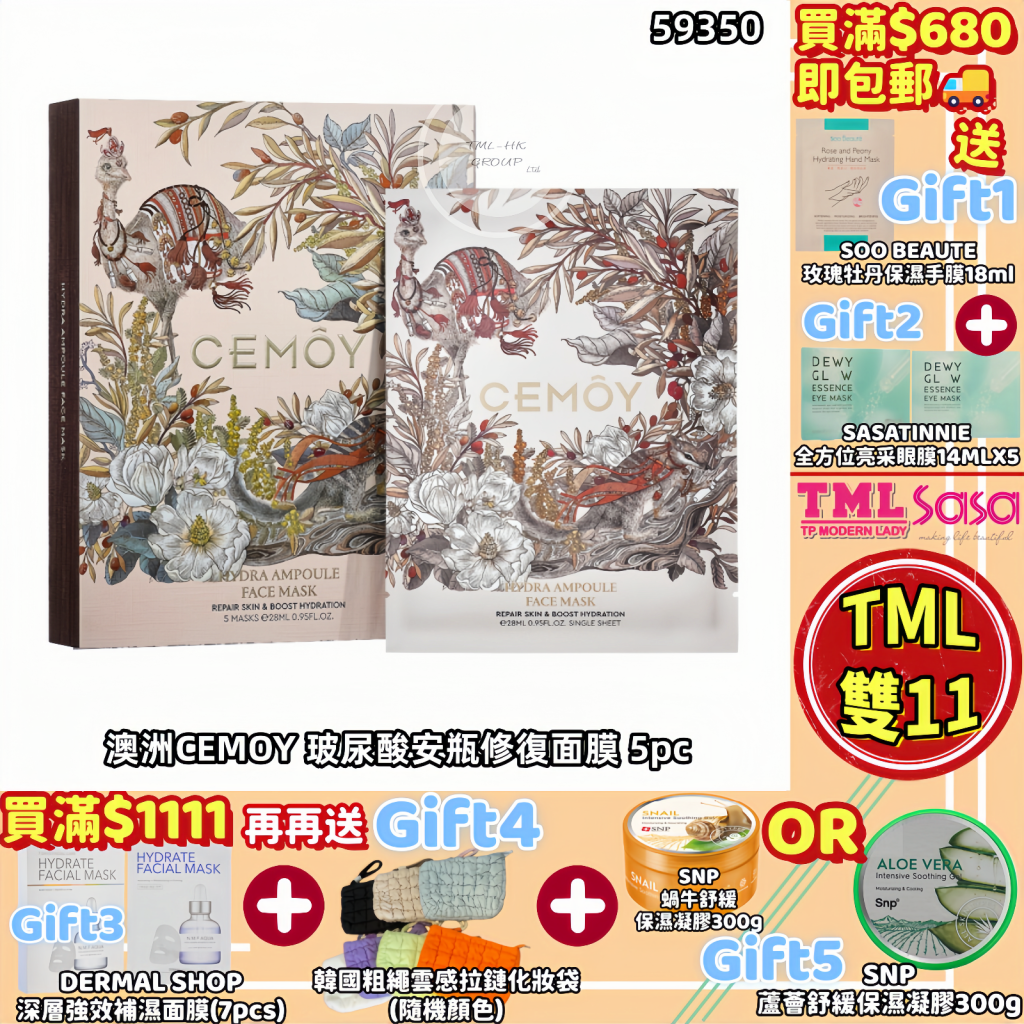 SASA X TML 澳洲CEMOY 玻尿酸安瓶修復面膜 DEEP COLLAGEN POWER BOOSTING 5PC【全場買滿$680包郵 | 16/11截單 | 預計聖誕前收貨 | 20251111(59350.)】
