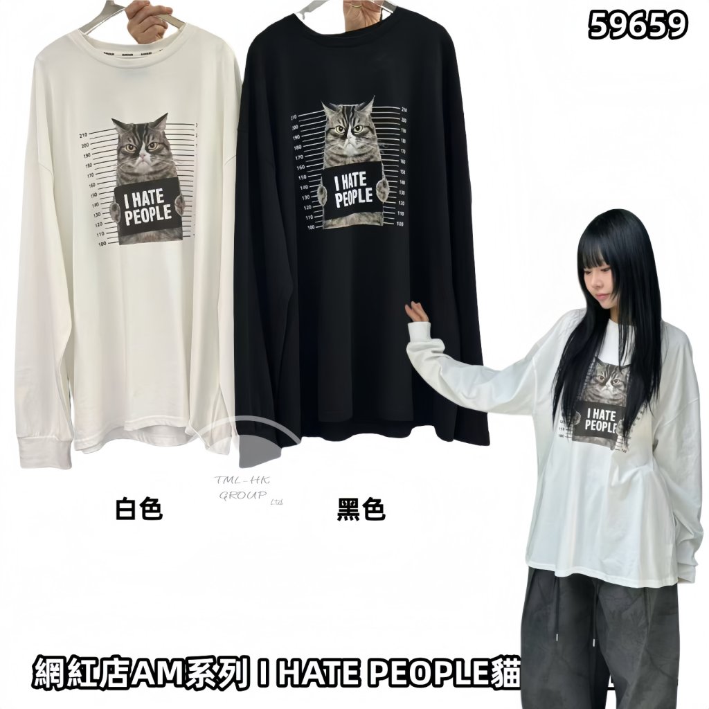 東大門網紅店AM系列 I HATE PEOPLE貓貓長袖TEE【5件包郵 | 30/11截單 | 預計1月初到貨 | 20251125B(59659.)】