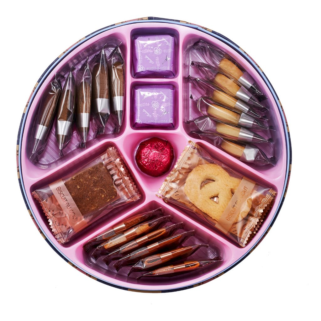 上層: 阿薩姆茶曲奇 x 5, 咖啡杏仁曲奇 x 4, 甜心牛油曲奇 x 6, 雲呢拿味薄餅 x 6, 椰奶曲奇 x 3, 藍莓味酥 x 2, 榛子味朱古力 x 1