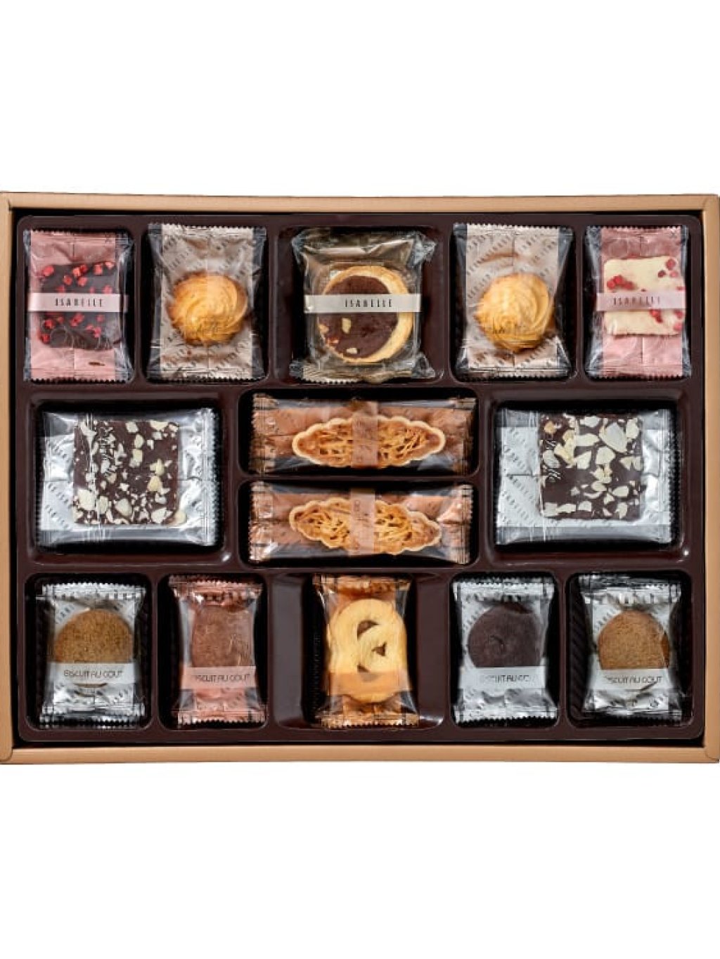 香草莓果薄餅 x 4, 士多啤梨薄餅 x 4, 鹹蛋黃曲奇 x 4, 阿薩姆茶曲奇 x 4, 咖啡杏仁曲奇 x 4, 椰奶曲奇 x 4, 紅莓紅酒曲奇 x 4, 焦糖杏仁船 x 8, 杏仁朱古力法式煎餅 x 8, 朱古力藍莓小蛋糕 x 2