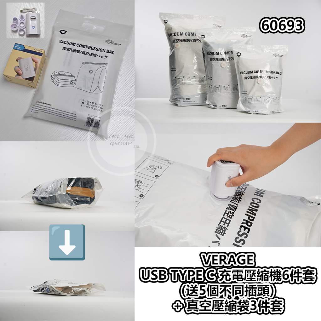 VERAGE USB TYPE C 充電壓縮機6件套(送5個不同插頭) + 真空壓縮袋3件套【4/1截單 | 預計1月尾前到貨 | 20251230(60693.)】