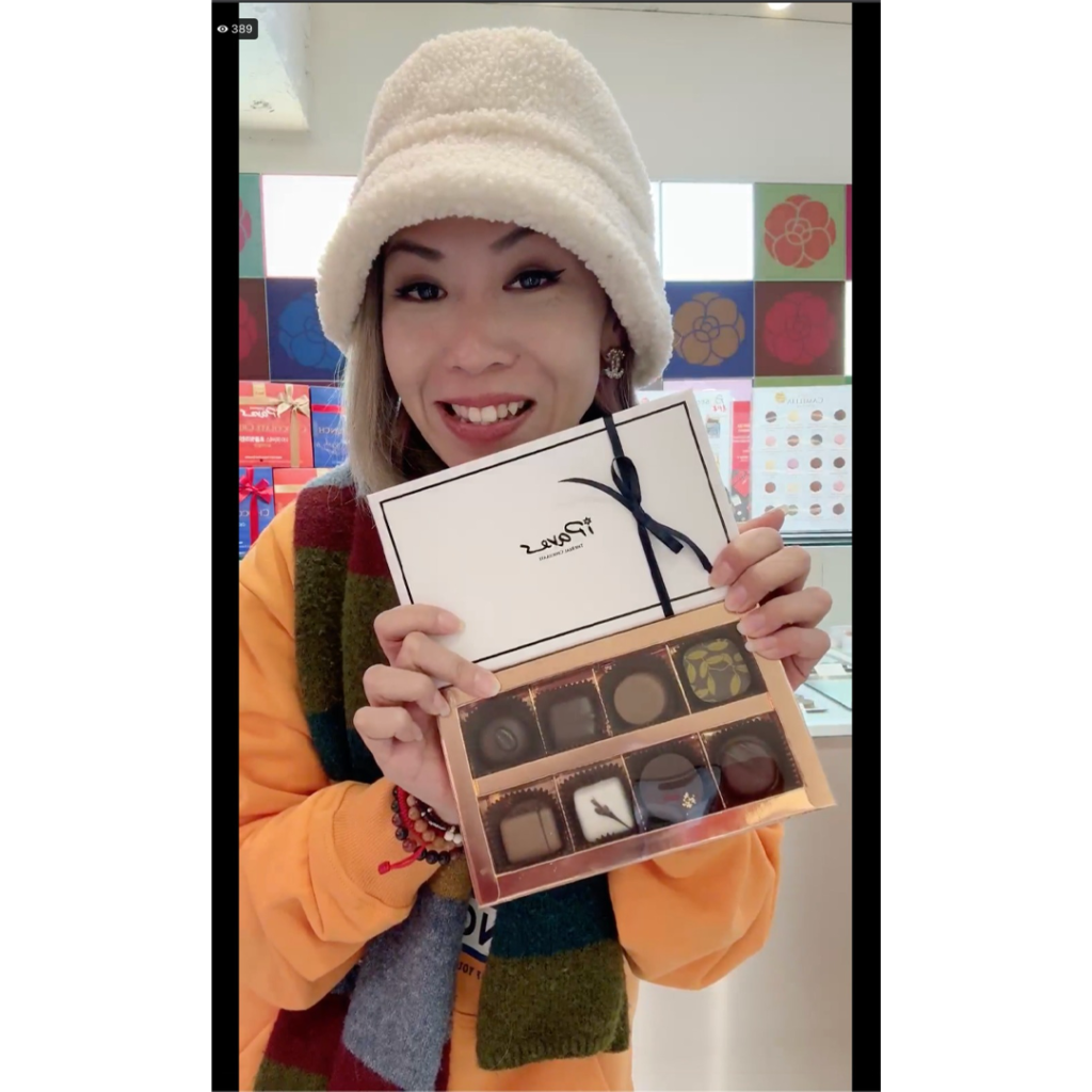 1.浸泡綠茶與茉莉花香的甘納許/黑巧克力包裹,茶葉圖案印花