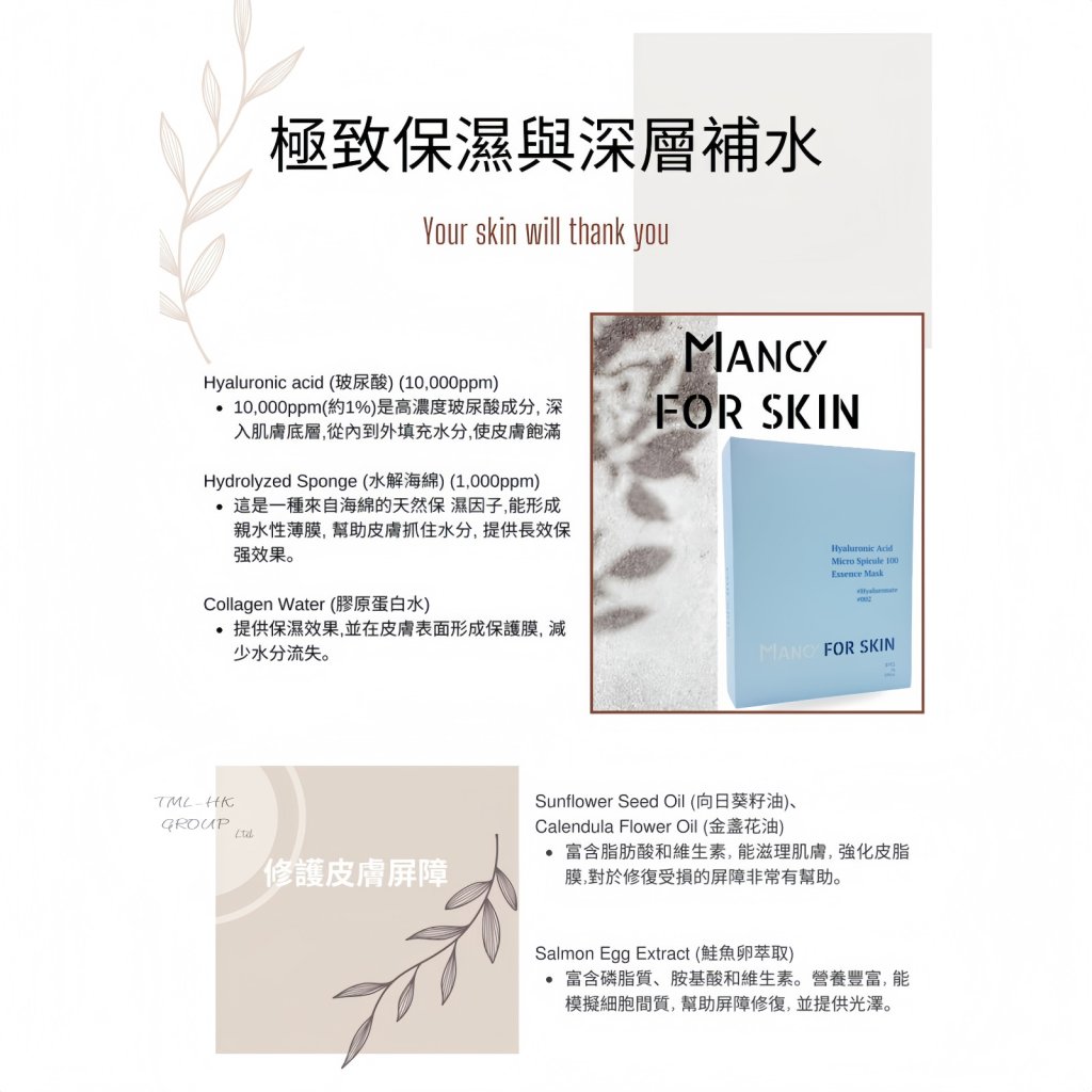 Mancy For Skin Hyaluronic Acid Micro Spicule 100 Essence Mask 10片/1盒【指定Mancy 產品 買滿 $1000 包郵 | 11/1截單 | 預計2月初到貨 | 20260107A(61034.)】