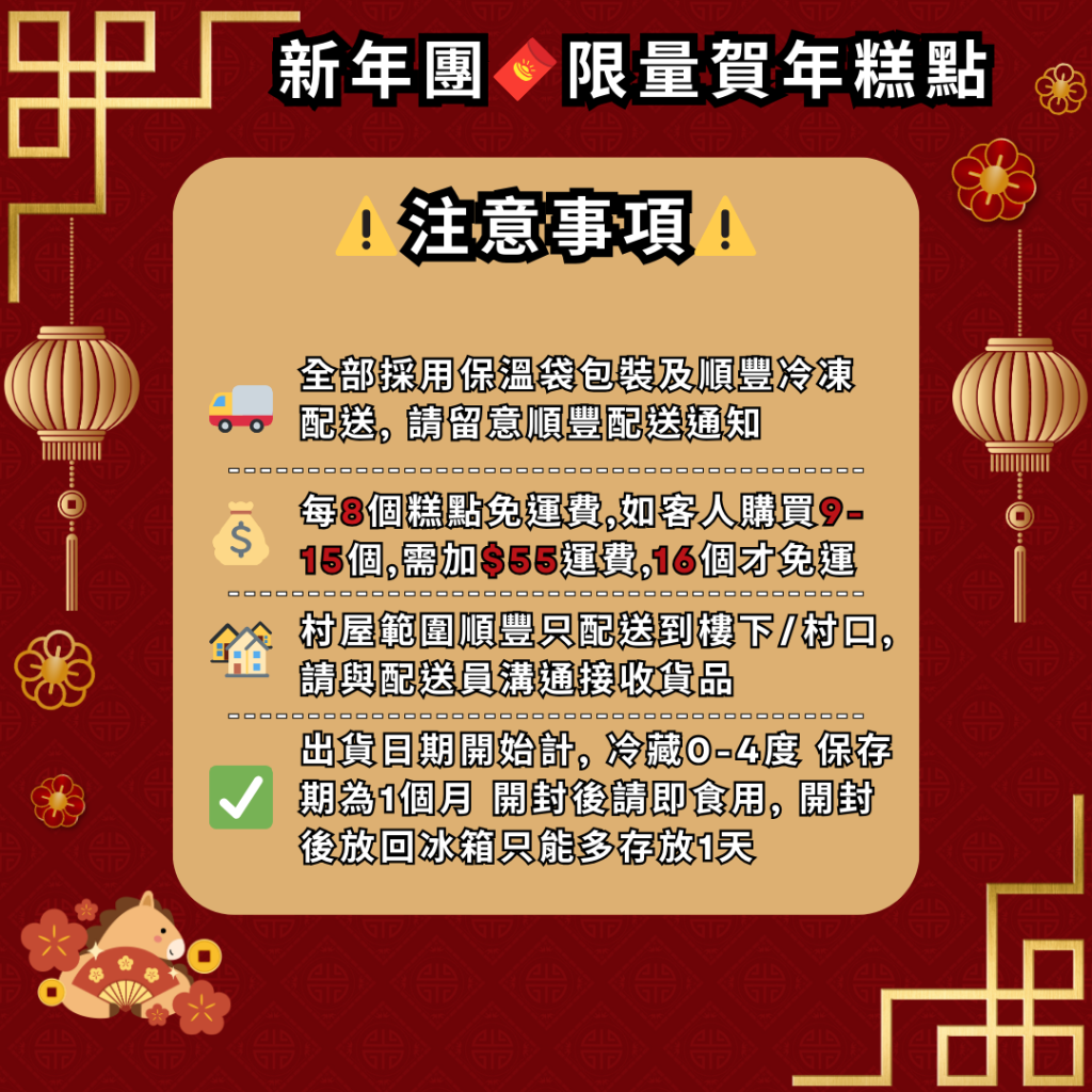 主頁 新年團 限量賀年糕點 不滿8/16件(如此類推)順豐凍鏈郵費【21/1截單 | 由供應商聯絡順豐凍鏈出貨 | 20260115Z(61203.)】