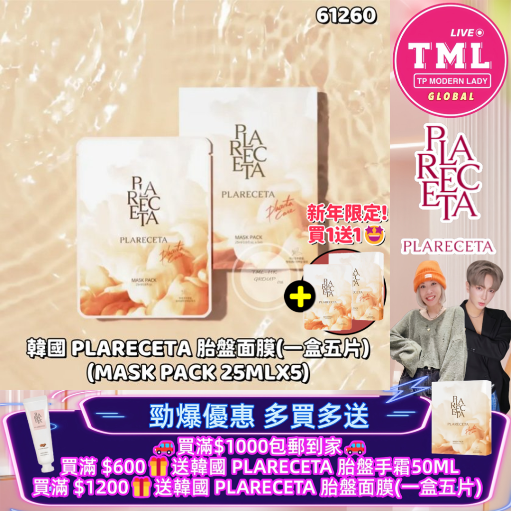 韓國 PLARECETA 胎盤面膜(一盒五片)(MASK PACK 25MLX5)(買一送一)【買滿$1000包郵 | 22/1截單 | 預計3月尾至4月初到貨 | 20260117B(61260.)】
