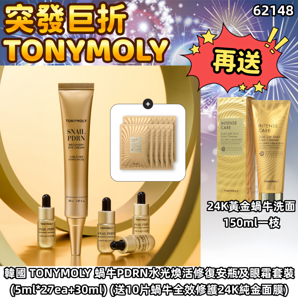 韓國 TONYMOLY 蝸牛PDRN水光煥活修復安瓶及眼霜套裝(5ml*27ea+30ml) (送10片蝸牛全效修護24K純金面膜)【14/2截單 | 預計3月中至尾到貨 | 20260209B(62148.)】