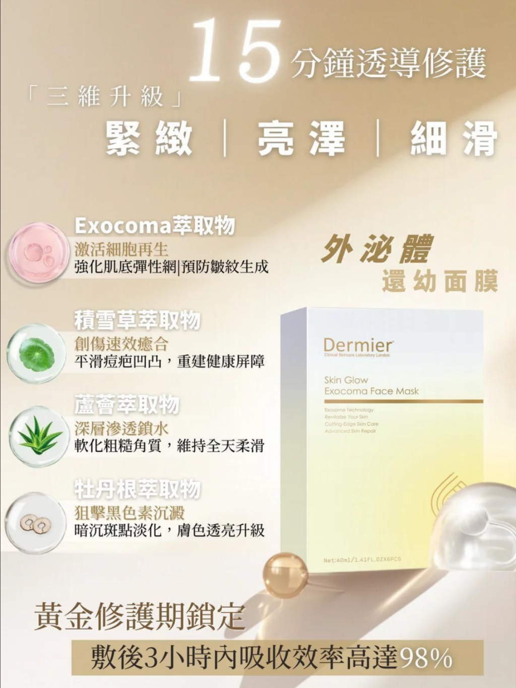 15分鐘高效見證:單次使用即可感受膚質柔滑度與透亮度提升。