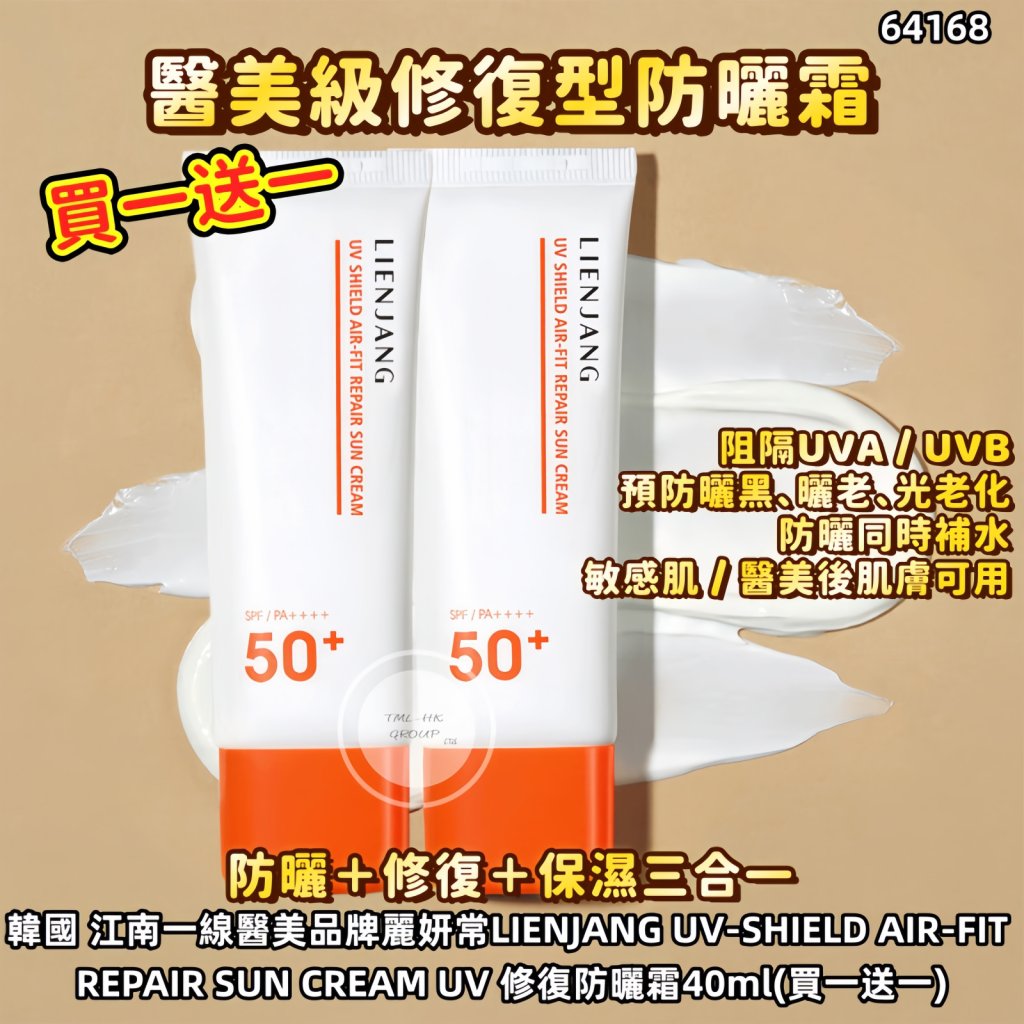 主頁 韓國 江南一線醫美品牌麗妍常LIENJANG UV-SHIELD AIR-FIT REPAIR SUN CREAM UV SPF50+PA++++修復防曬霜40ml(買一送一)【$1000包郵 | 9/4截單 | 預計5月中到貨 | 20260404A(64168.)】
