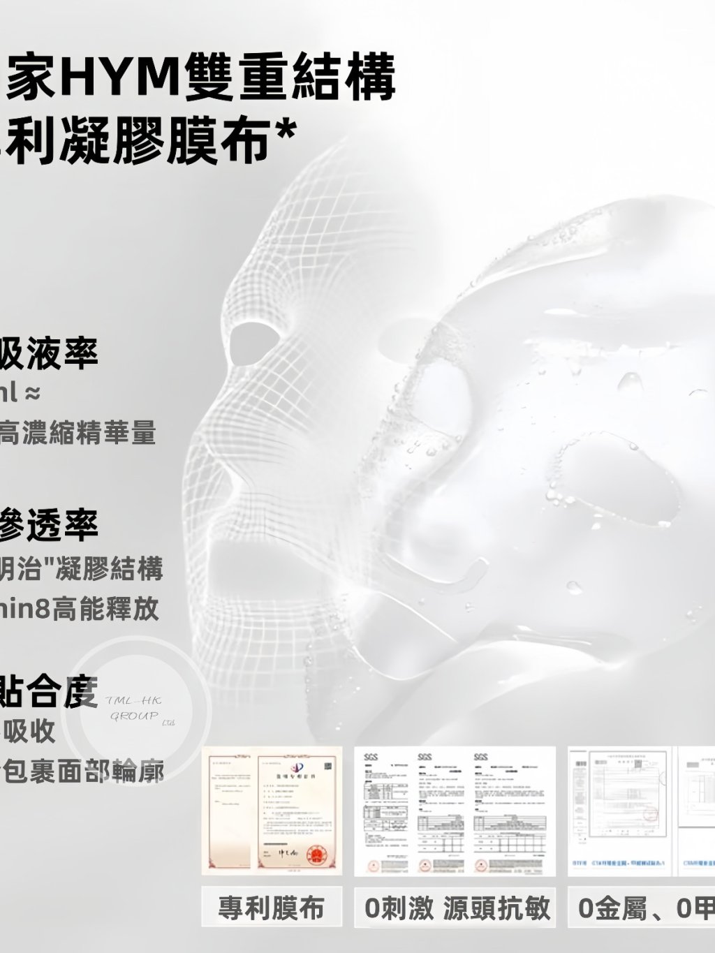 專利 HYM 凝膠膜布:混和型凝膠材質貼合度高,適合長時間敷用 (約 20-30 分鐘) 而不輕易乾涸。