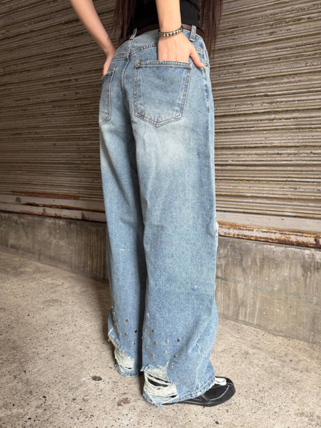 日本 WEGO 洗水後腳破爛釘片牛仔闊褲(FG26SS-073)【買滿$1500包郵 | 19/4截單 | 預計6月中至尾到貨 | 20260414A(65156)】