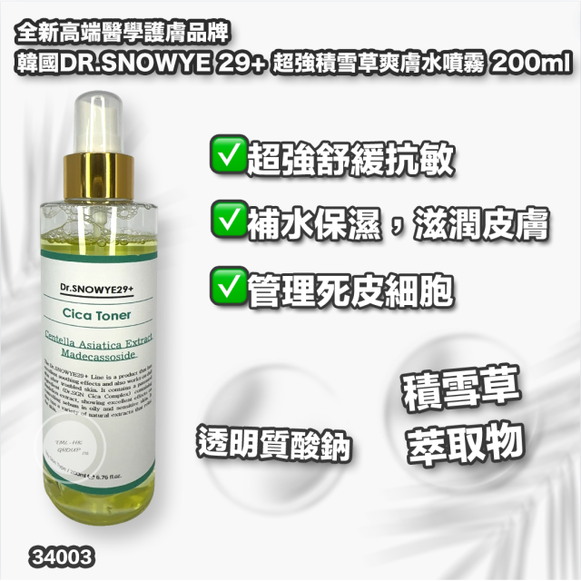 韓國DR.SNOWYE 29+ CICA TONER 超強積雪草爽膚水噴霧200ml【15/11截單 | 預計11月尾派貨 | 20251110(34003.)】