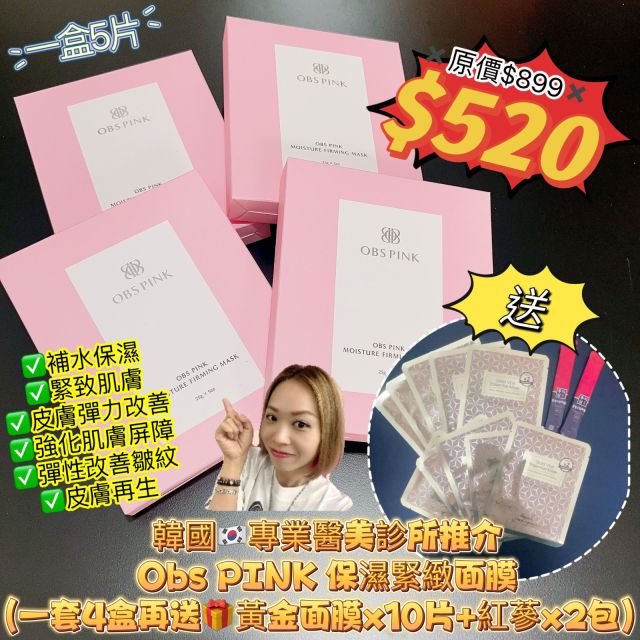 29530.🌟26/4月韓國🇰🇷連線🌟韓國🇰🇷專業醫美診所推介Obs PINK 保濕緊緻面膜(一盒5片)(一套4盒再送🎁黃金面膜x10片+紅蔘x2包)⚠️1/5截單⚠️預計5月中至尾到貨❣️
