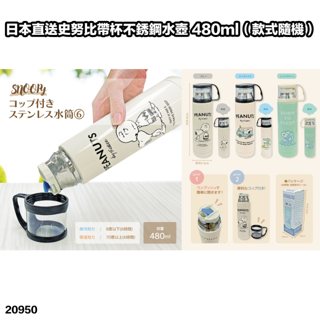 20950.🐥執雞🐥日本直送史努比帶杯不銹鋼水壺 480ml🌟米白色🌟⚠️數量有限⚠️先入先得⚠️售完即止⚠️