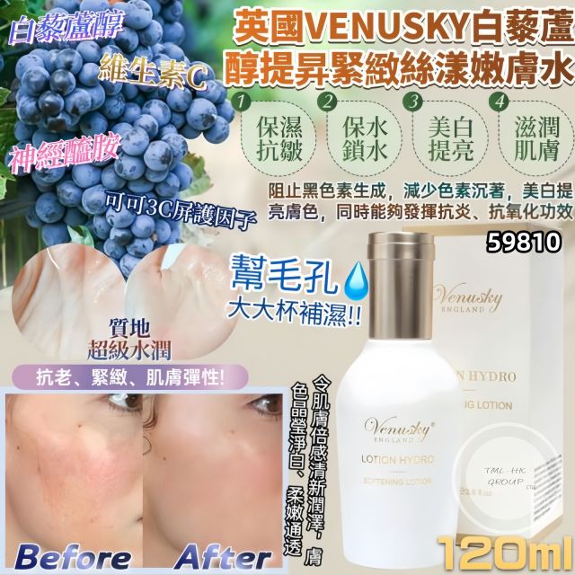 英國 VENUSKY白藜蘆醇提升緊緻絲漾乳液 120ml【買滿$1000包郵 | 9/12截單 | 預計12月尾到貨 | 20251204(59812.)】