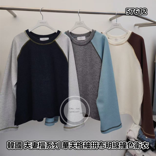 韓國 夫妻檔系列 華夫格袖拼布明線撞色衛衣【買滿5件包郵 | 28/11截單 | 預計12月尾至1月初到貨 | 20251123B(57612.)】